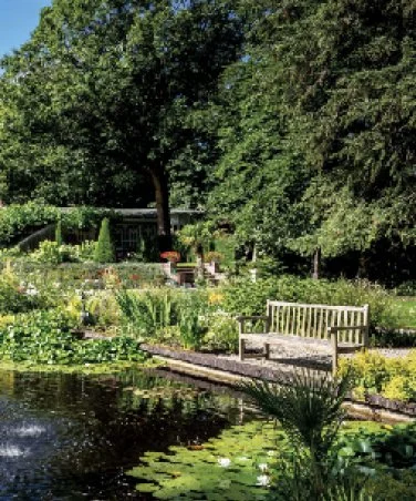 Kenmerkend voor de parkachtige setting van Nispen | Laren zullen dan ook de romantische paden zijn, die zich losjes tussen de bomen, frisgroene gazons en bloeiende borders door slingeren. In de tuin is ook plek voor typerende Springer-elementen, zoals lage muurtjes, een pergola, een paviljoentje en een vijver. Groenblijvende heesters en hagen bieden – ook in de wintermaanden – structuur én privacy. In het beplantingsplan zal uiteraard worden aangehaakt bij lokale klassiekers als rododendrons en rozen, magnolia’s en krentenboompjes. Dit waarborgt niet alleen de genius loci, maar draagt ook bij aan de lokale biodiversiteit.
