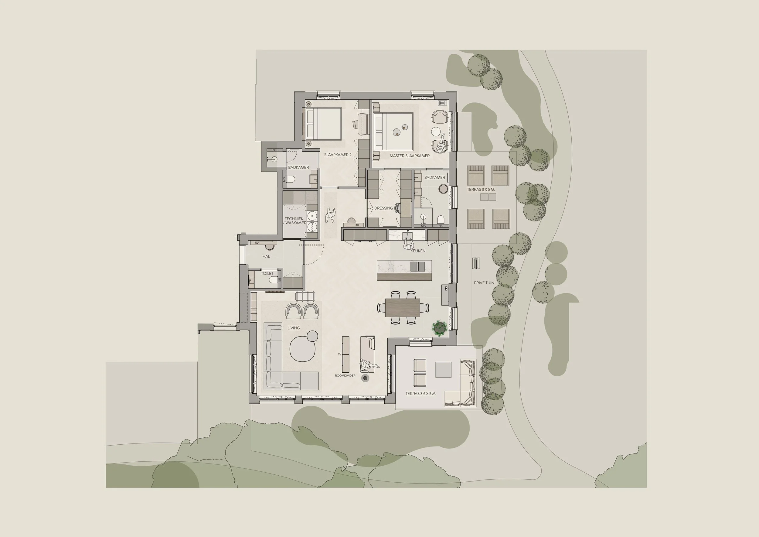 Alle technische installaties, waaronder de warmtepomp, hydrofoor, waterontharder en een separate installatie voor de vloerverwarming, zijn discreet ondergebracht in de parkeergarage. Hierdoor blijft het appartement volledig gericht op wonen, zonder verlies van kostbare vierkante meters en met onderhoud buiten de woning.
