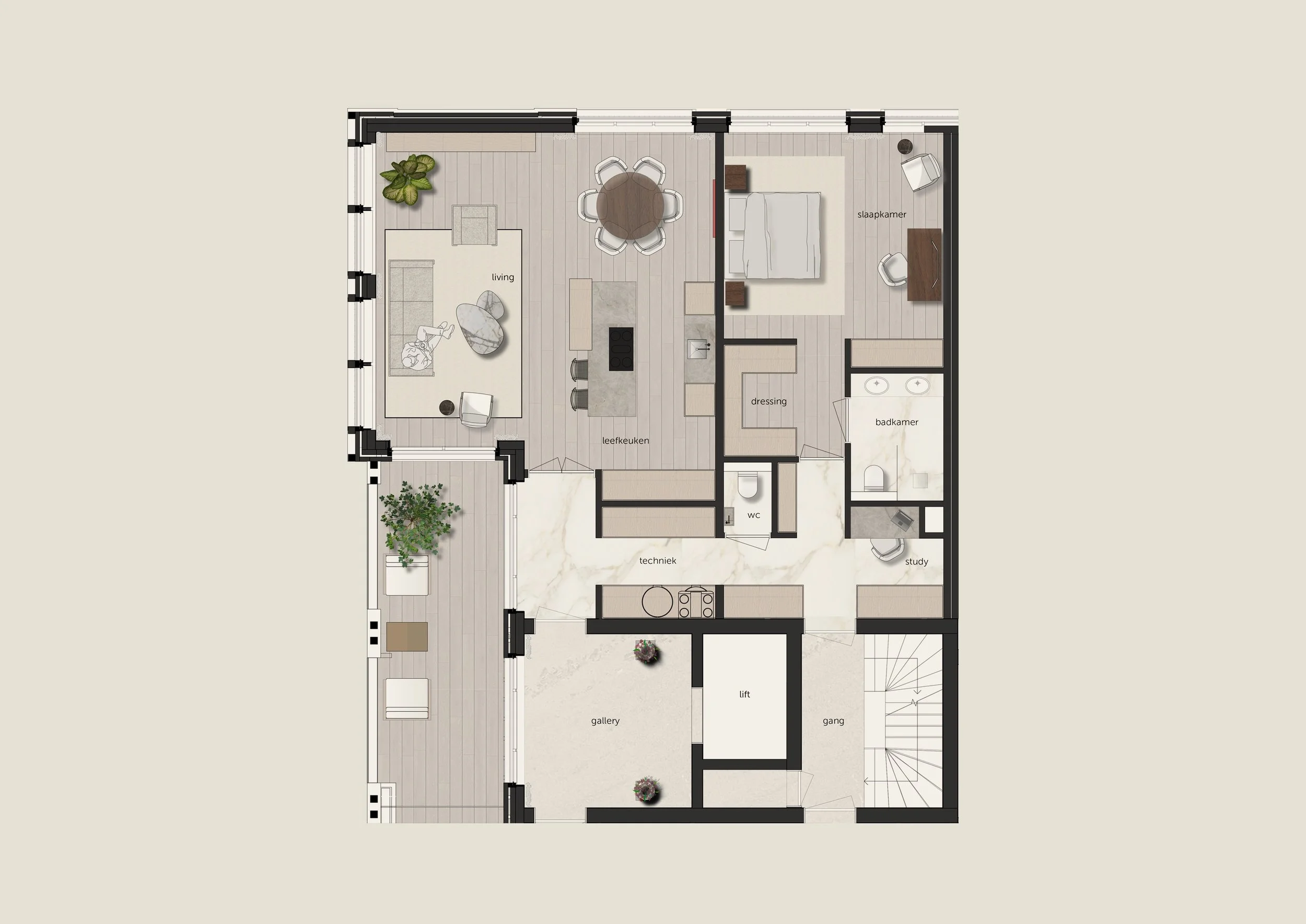 Dit appartement combineert de allure van een vijfsterren hotelsuite met het comfort en de vrijheid van een eigen woning. Ideaal voor wie op zoek is naar een zorgeloze, hoogwaardige woonbeleving, zonder concessies te doen aan privacy of ruimte.